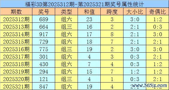 开奖纪念:福彩3D第2025321期开出奖号847。奖号模式为组六,奇偶比为1:2,012路比为0:2:1,大小比为2:1,和值为19,跨度为4。